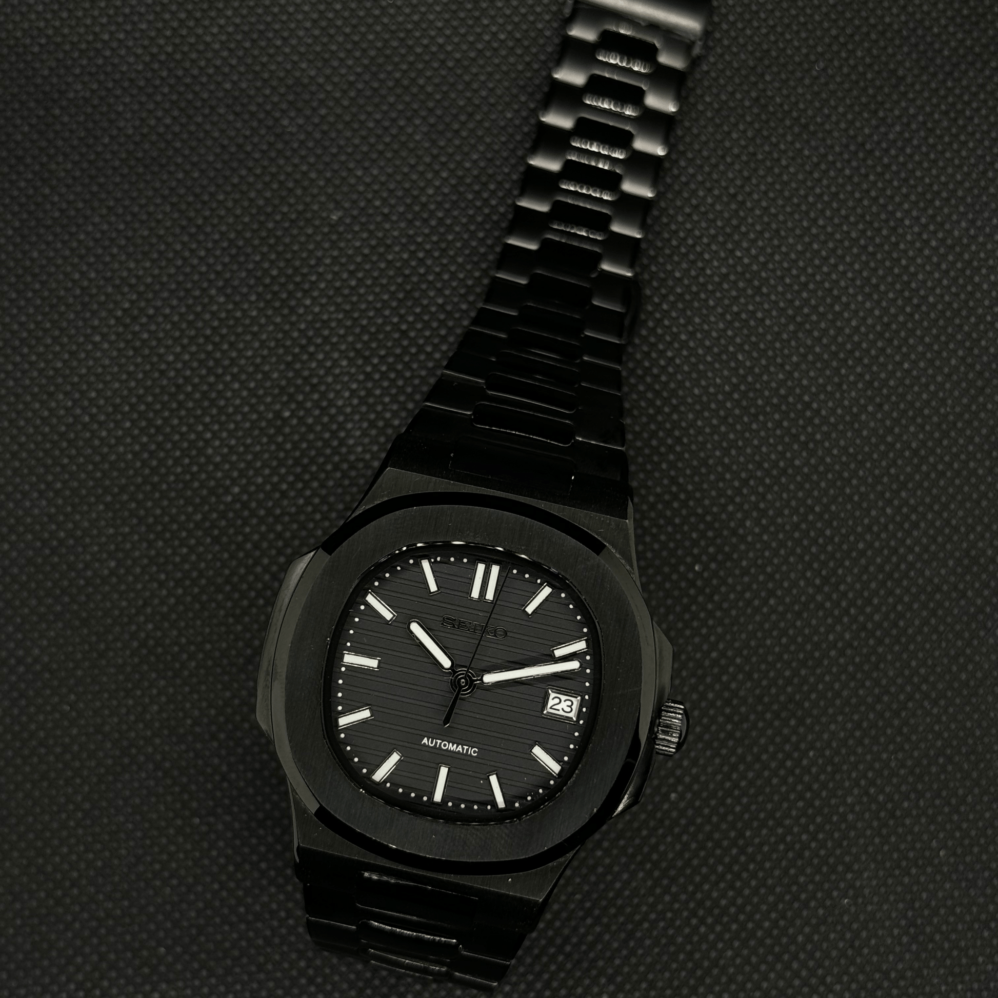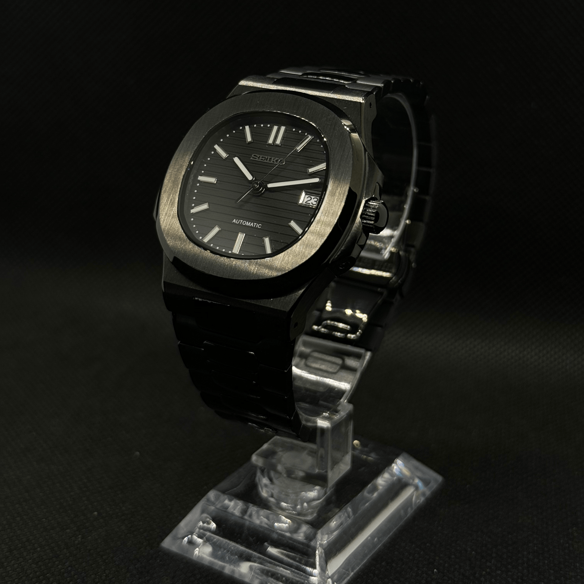 Inspired by the iconic Nautilus design, and featuring the prestigious Seiko NH35 automatic movement, we present the Seiko Mod Nautilus. A 41 mm high-end quality watch combining the perfect alliance between excellence and accessibility.