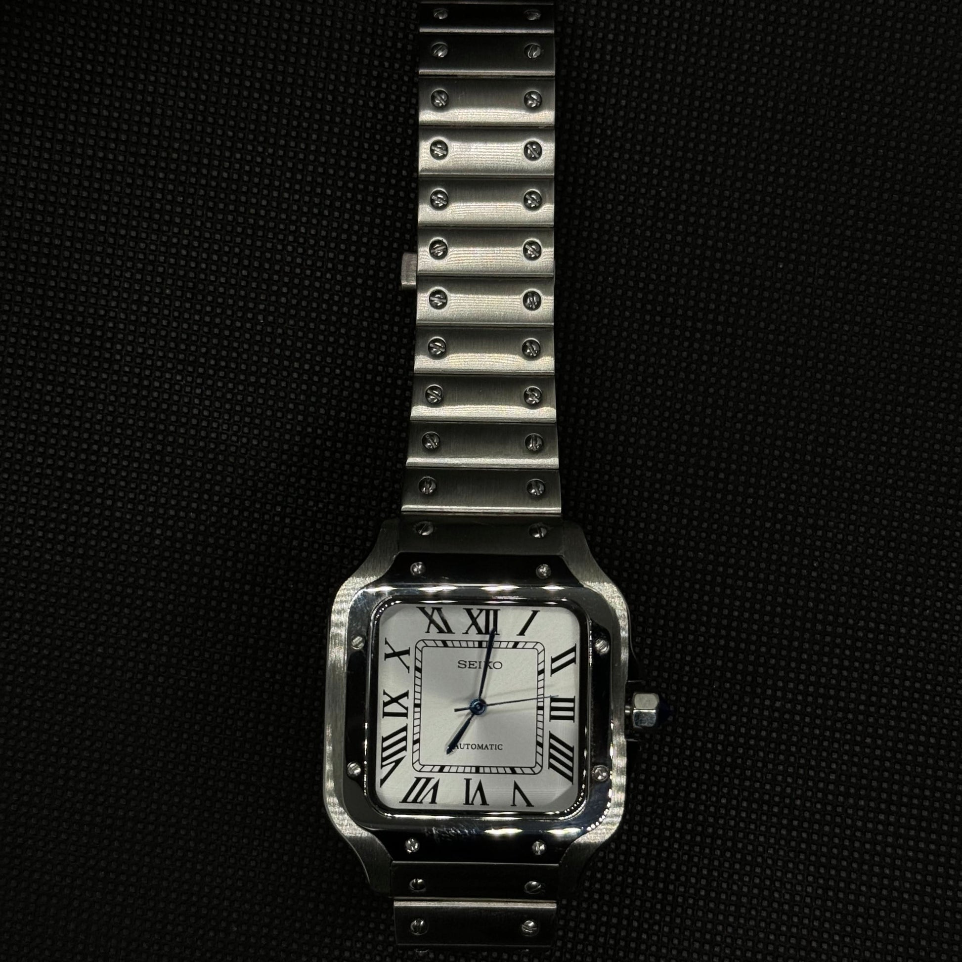 Inspired by the iconic Santos design, and featuring the prestigious Seiko NH35 automatic movement, we present the Seiko Mod Santos. A 38 mm high-end quality watch combining the perfect alliance between excellence and accessibility.
